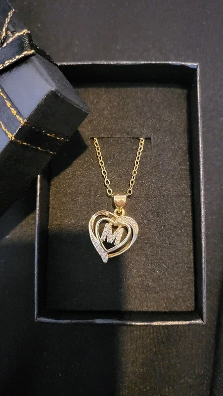joli collier doré avec pendentif double cœur et lettre "M". Matière : Acier inoxydable (résiste à l'eau, ne noircit pas). Design : Orné de strass brillants style zirconium.